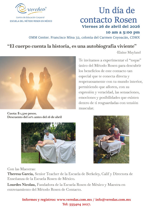 Un dia de Contacto Rosen Un día para explorar las posibilidades sanadoras del contacto consigo mismo y con los demás. Un camino de reencuentro y de relación.Viernes 26 de Abril, 202610 AM a 5 PMCuota: $1,500 pesosDescuento del 10% antes del 16 de abril. Escríbenos si necesitas información o inscribirte a este curso: Nombre Email Ciudad Mensaje Enviar